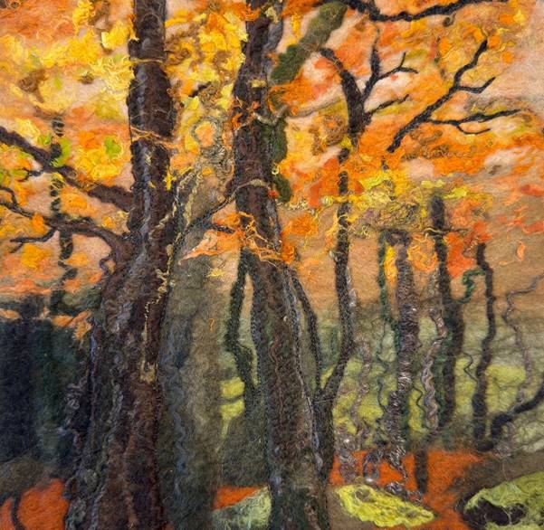 Alongside these narrative works, Robyn has recently begun exploring a more experimental direction, creating abstract pieces that incorporate silks, mixed fibres, and painted prints. This evolving practice allows her to push the boundaries of felt as a medium while retaining its tactile, organic quality.