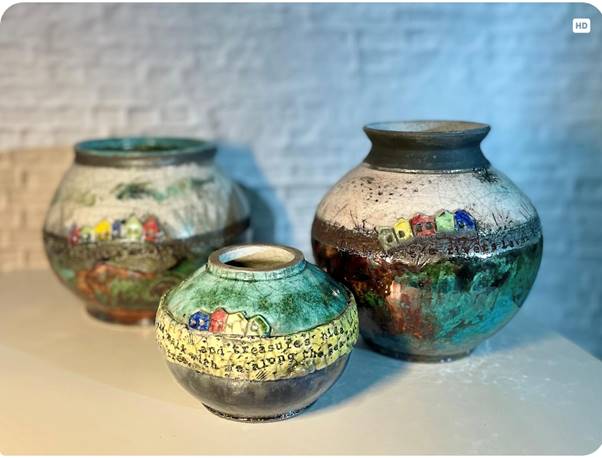 Alan Hill, a former engineering manager, created Aby Ceramics when he relocated to Lincolnshire in 2020. For 5 years Alan had previously attended the EMFEC Ceramics course; until work got in the way of play for many years. Now in his Aby home studio Alan makes wheel-thrown pottery to produce pieces inspired by Lincolnshire, often a strong influence of the coastal environment. Much of his work uses the Raku process to produce vibrant coppers, greens & blues. He describes his recent work as “Textural” , combining the textures of natural found objects with text and poetry, through layers of “paperclay”, creating a journey to explore.