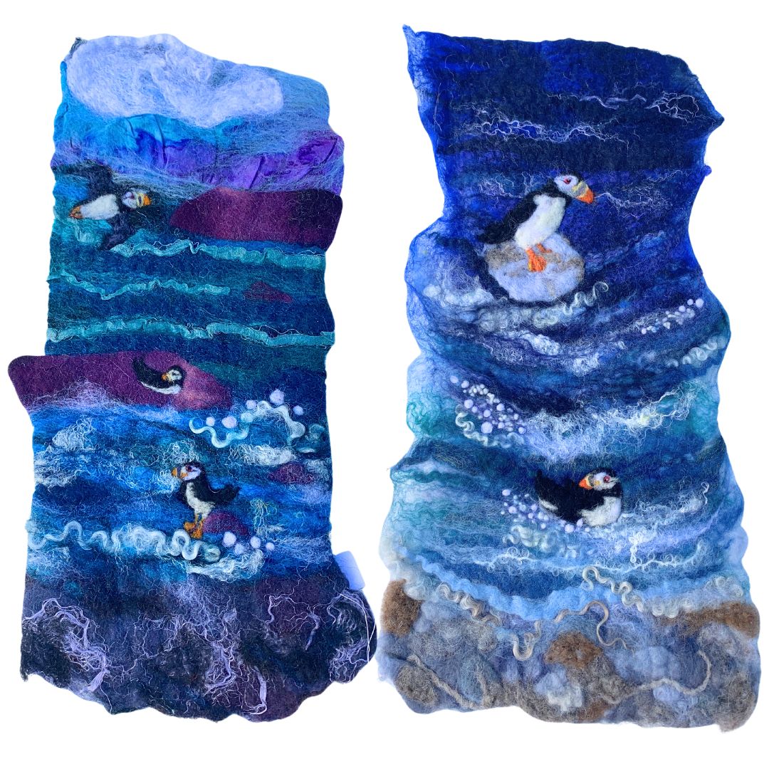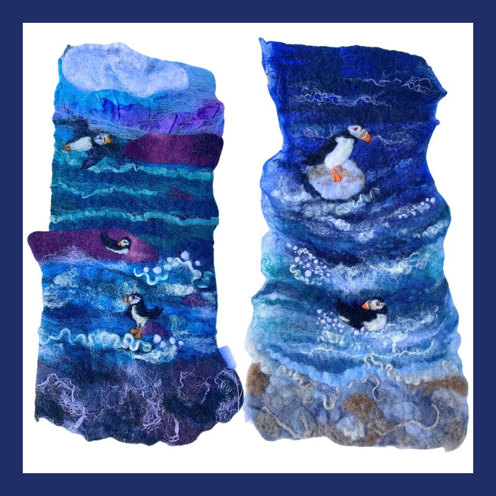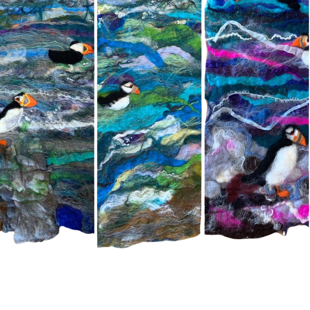Over the last 15 years of teaching felting I have developed techniques to help guide students to create artworks they are proud of. The techniques I use show you step by step to create each puffin using fibres that I use to create my own art.