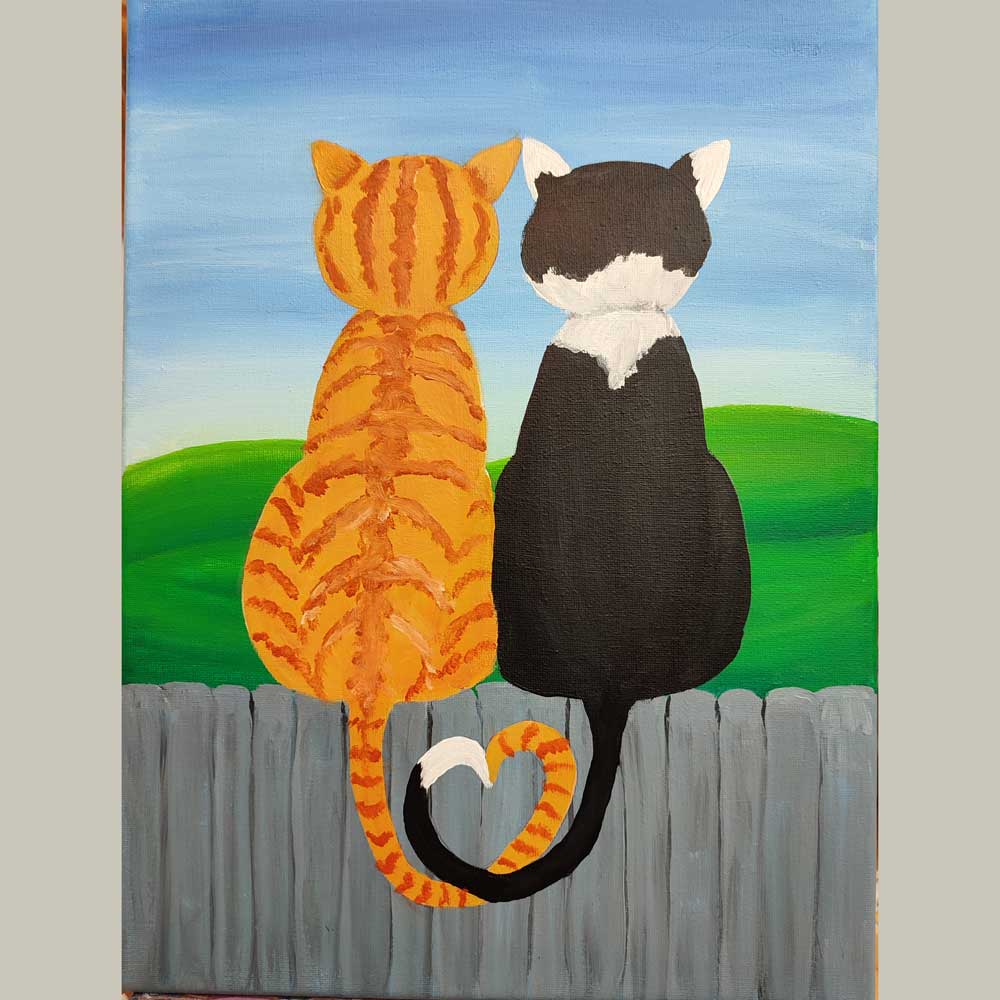 Celebrate Valentine’s Day with creativity and fun at our Beginners Acrylic Painting Workshop! In this relaxed session, you’ll be guided step by step to create a charming painting of two cats with interlinked tails forming a heart — the perfect symbol of love and togetherness.