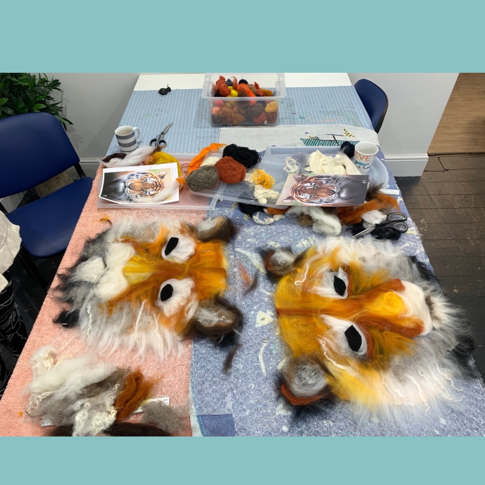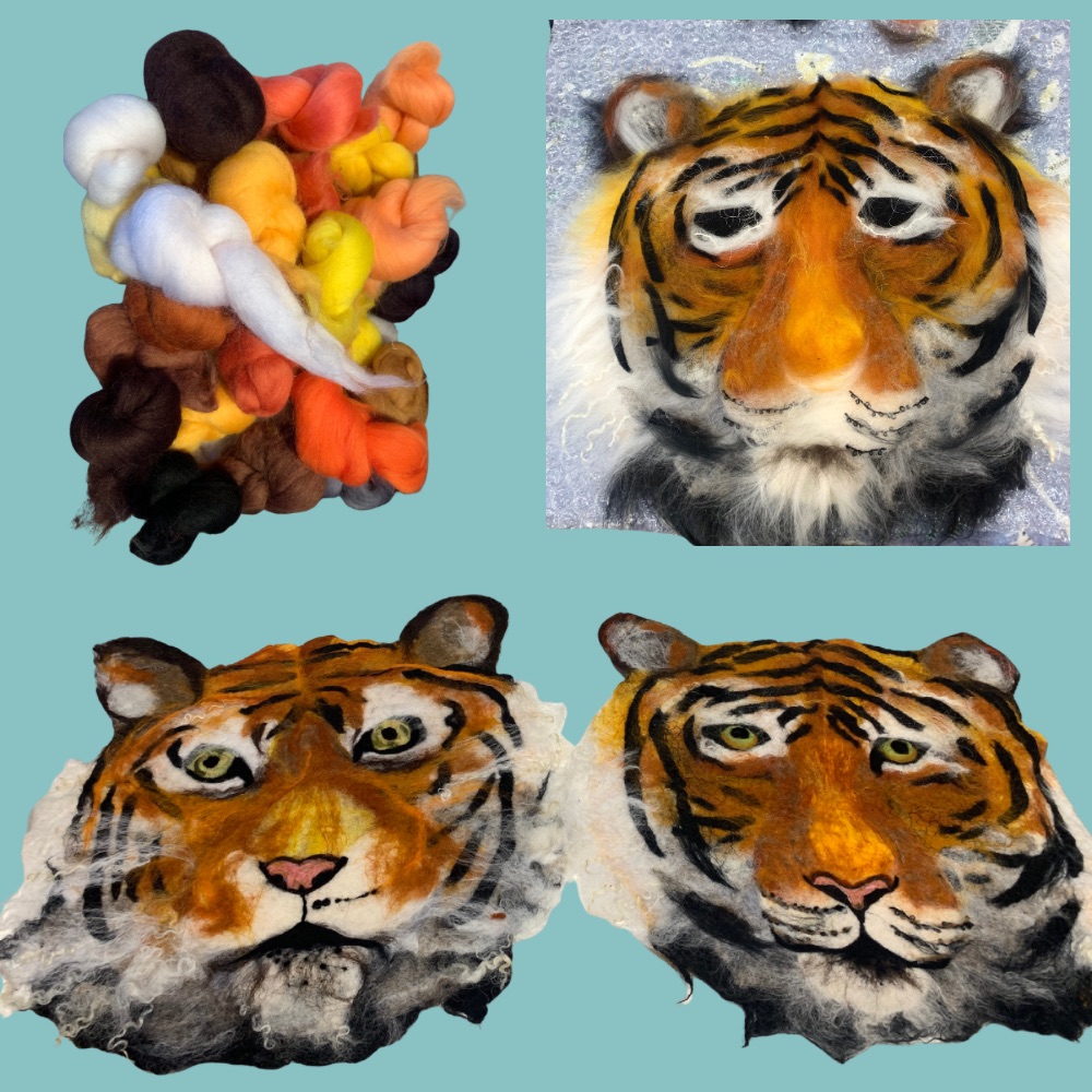 In this half day workshop you will learn how to layer wool fibres and silks to create a felted portrait of a tiger. We will begin by choosing colours and laying out the ears and nose pieces. Follow step by step instructions to measure out the facial features. Learn how to layer merino wool to create depth and realism in the piece.